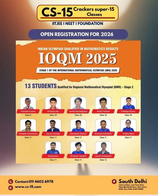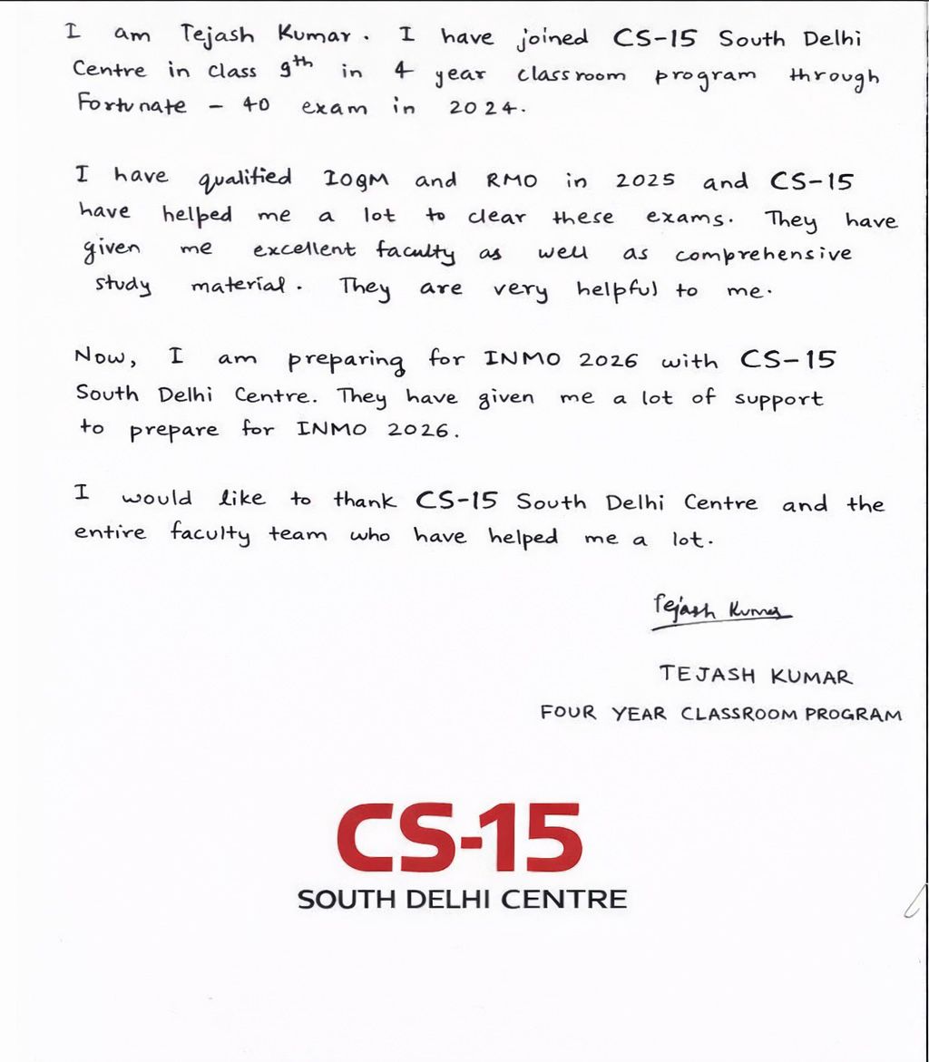 CS-15 All India Test Series for Olympiads - yet another recent innovation by CS-15 - Nurturing Your Olympiad Dreams – Simulating Real Olympiad Experience (for Students presently in Class V, VI, VII, VIII, IX, X, XI & XII) For full schedule of All India Test Series for Olympiads until 2028, to register for one or more tests, and to get more information about the test series & various stages of Olympiads applicable, visit our DELHI CENTRE/www.cs-15.com